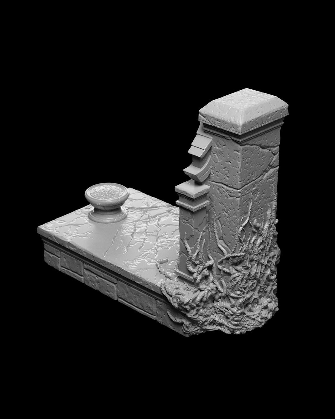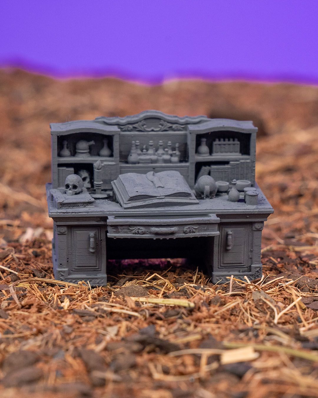 Mausoleum, jail cell, 2 candle holders, 2 gargoyles, sarcophagus, grave dining room set, Alchemy desk, torture table, and throne.
